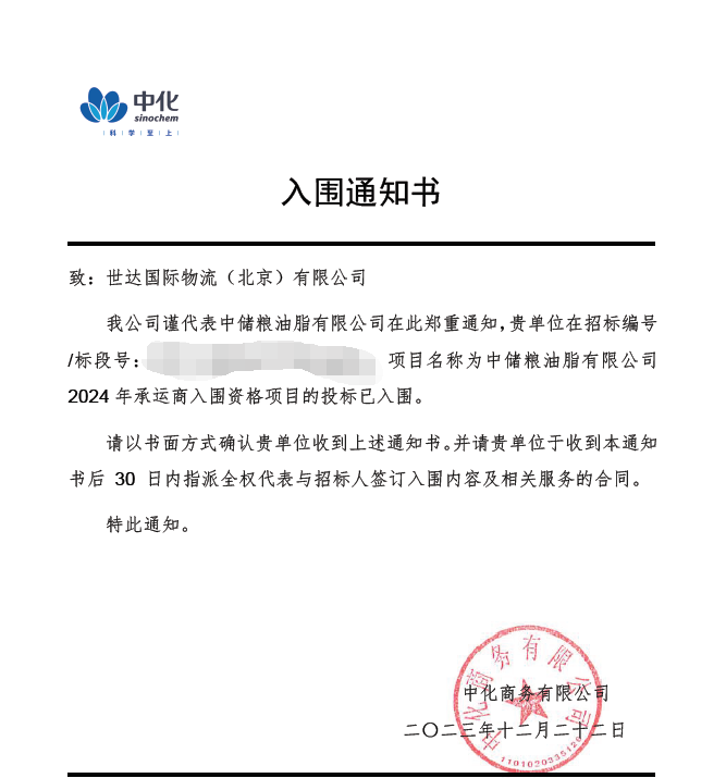 喜訊丨熱烈祝賀世達(dá)國(guó)際物流(北京)有限公司入圍中儲(chǔ)糧物流服務(wù)商